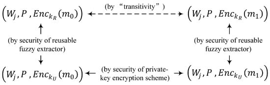 On the other hand, when in experiment then is given where is obtained by U through privacy amplification. Note that U is a uniform distribution over . This indicates that receives a ciphertext in the form of and