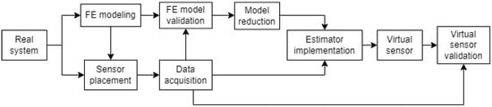 The selected vs. algorithms are tested on a use case defined in Section 2.4. First, an FE model of the use case is created. This model is used to choose the location of the sensors (strain gauges and accelerometers) in the real prototype. Measurement data obtained from the sensors is first used to adjust and validate the model, and then to feed the vs. algorithms. The obtained estimations are compared to the equivalent measurement data to evaluate the performance of the vs. algorithms under the different conditions. The entire process is summarized in the flowchart shown in Figure 1.