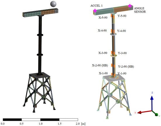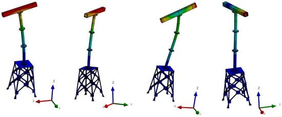 A FE model of the prototype is built based on the 3D CAD of the structure. The shaker and its support, including the bushing, are simplified to an equivalent point mass located at the mass center of the replaced components and attached to the structure. The behavior of the bushing has been tested in the frequency range of interest (0 to 25Hz), verifying its linearity. The platform has been designed to keep the mass center of the rotating components in the rotating axis, so the system can be considered invariant. The bolted joints present in the prototype are also simplified using bonded contacts. Due to the tower and nacelle of the wind turbine prototype being thin steel profile components, shell-type elements have been used to reduce the total number of elements in the mesh. In the jacket support structure, solid elements have been used. The primary features of the FE model can be seen in Table 2, and the FE model of the prototype can be seen in Figure 4.