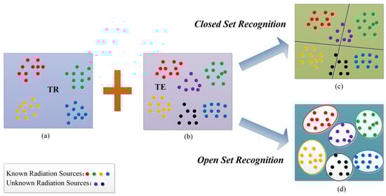 Closed set recognition and open set recognition of space radiation source. (a): Training Set TR. (b): Testing Set TE. (c): Closed Set Recognition. (d): Open Set Recognition.
