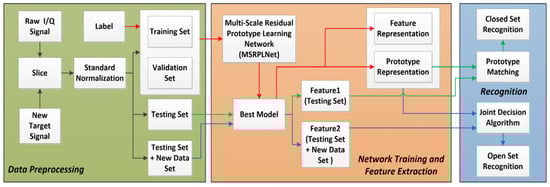 By introducing the prototype learning strategy, we propose a new space radiation source recognition method. Unlike the works in [12,28,29], our method pays more attention to learning separable features and discriminative features. The method can be used for the closed- and open-set recognition of space radiation sources. Figure 2 shows the framework of our proposed method, including data preprocessing, network training, feature extraction and recognition modules. In the data preprocessing module, raw I/Q signals are first sliced and normalized to construct the training set, validation set and testing set. The training set and validation set need to be labeled to learn the discriminative model. In the network training and feature extraction module, MSRPLNet is used to extract features with intra-class compactness and inter-class separability. When MSRPLNet training is completed, we can obtain the optimal model parameters, prototype representation and feature representation of the validation set. In the recognition module, when MSRPLNet extracts features from the testing set, the prototype representation and prototype matching can be used to recognize the closed set of space radiation sources. In addition, when the testing set contains unknown radiation source samples, the joint decision algorithm based on MSRPLNet can not only classify known radiation source samples but also detect and reject unknown radiation source samples.