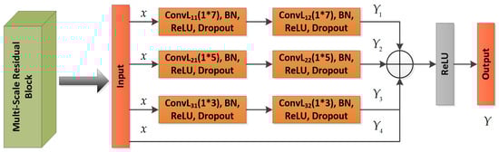 where performs the convolutional block operation, which consists of a convolutional layer with a kernel, a batch normalization layer, an ReLU activation layer and a dropout layer with a discard rate of 0.5. is the input of the multi-scale residual block. represents the add operator. and represent the first route feature, the second route feature, the third route feature and the fourth route feature, respectively.
