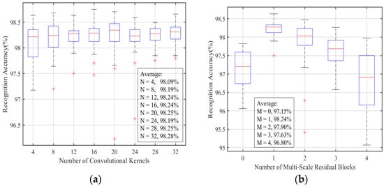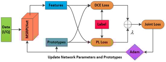 MSRPLNet has multi-scale residual blocks that can be used to fuse different levels of separable features, which improves the inter-class recognition effect. However, when the inter-class distance is less than the intra-class distance, the intra-class diversity will reduce the recognition effect. As shown in Figure 5, MSRPLNet introduces distance cross-entropy loss (DCE Loss) and prototype loss (PL Loss) for model training to further enhance the inter-class separation and intra-class compactness of features. MSRPLNet will maintain and learn several prototypes for each class. We denote the prototype as , where represents the category index, is the number of categories, represents the index of the prototypes in each class and is the number of prototypes in each class. Prototypes can be seen as abstract representations of features and learned along with features. Joint Loss based on prototype learning is weighted by DCE Loss and PL Loss. During the training process of MSRPLNet, the Adam optimizer is used to optimize Joint Loss to update network parameters and prototypes. In addition, when the current recognition accuracy of the validation set is lower than before, the learning rate is multiplied by a decay factor .