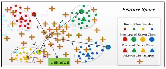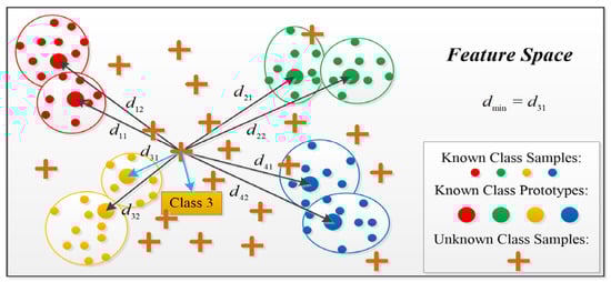 As shown in Figure 7, we assume that each class has only one prototype. Let the feature of the sample extracted by MSRPLNet is . The prototype with the smallest Euclidean distance from is . The center feature of class corresponding to is . is given by the average value of the sample features recognized correctly for each class in the validation set. Given two thresholds and , when the following relationship is satisfied