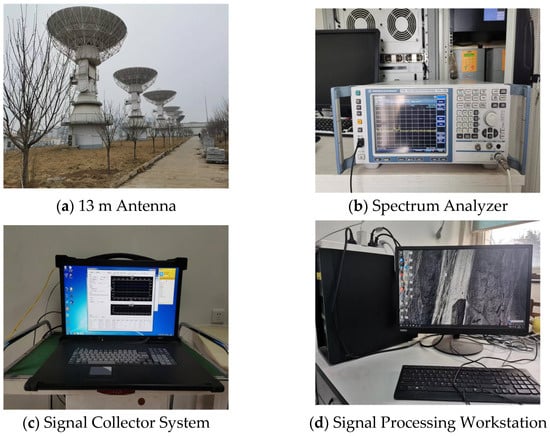 In order to truly verify the effectiveness and reliability of the proposed method, we build a set of satellite signal observation and receiving systems in the Xi’an Experimental Field of the National Time Service Center, Chinese Academy of Sciences. Figure 8 shows the main equipment used in the system, including a spectrum analyzer, an L-band 13 m large-aperture antenna, a signal collector system and a signal processing workstation. We first calculate the tracking time, azimuth and pitch angle of the antenna based on the TLE data of the Iridium. The above information is then imported into the antenna’s computer so that the antenna automatically tracks the position of the Iridium and receives the maximum gain signal. We use the spectrum analyzer to observe and search for Iridium signals in the L-band. When the signal frequency range is determined, the signal collector system is used to acquire the Iridium signal in this frequency range. The subsequent processing of the Iridium signal is completed on the workstation.