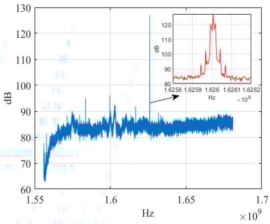 We collected eight Iridium STL signals for experimental validation. Table 1 gives some information about Iridium and its STL signal. The signal-to-noise ratio (SNR) range of the Iridium STL signals is about 10~14 dB by using the M2M4 algorithm. Because the wide-band signal collector system we use may collect multiple frequency signals, we perform parametric analysis and spectrum detection of all received Iridium signals before the experiment and separate the target signals. Figure 9 shows the spectrogram of an Iridium STL signal after smoothing filtering.