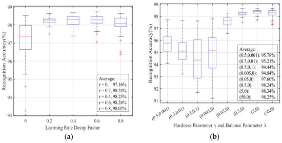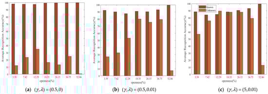 In order to further understand the influence of on the recognition performance of the joint decision algorithm, Figure 17a–c give the recognition accuracy of known Iridium target samples and unknown Iridium target samples in the testing set respectively when , and . We can find that when , the proposed joint decision algorithm has a better recognition effect on known Iridium targets than on unknown Iridium targets. It shows that MSRPLNet only pays attention to the inter-class separation of known targets and ignores the intra-class compactness. Therefore, the joint decision algorithm makes the wrong decisions on many unknown Iridium target samples. When increases from 0.5 to 5 and increases from 0 to 0.01, the recognition accuracy of the proposed joint decision algorithm for unknown Iridium targets gradually increases. It shows that enhancing the inter-class separation and intra-class compactness of features can significantly improve the open set recognition performance of the joint decision algorithm. In addition, when , the recognition accuracy of unknown Iridium targets is low. It reflects that too large will make the open set recognition more difficult.