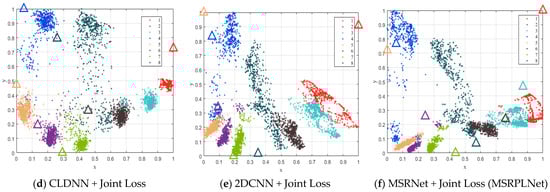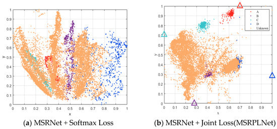 In order to further illustrate the effectiveness of the proposed method for the open-set recognition of eight Iridium targets, we perform two individual evaluation experiments. The first experiment shows that MSRPLNet can obviously improve the open set recognition accuracy. The testing set contains the samples of four known Iridium targets (A~D corresponds to target 1~4) and four unknown Iridium targets (unknown targets correspond to 5~8) when . The number of feature points for each known Iridium target is 540, and the number of feature points for each unknown Iridium target is 2700. As shown in Figure 19a,b, we used the PCA method to convert features and prototypes into a two-dimensional scatter map. In Figure 19a, it is clear that the four known Iridium target features are highly separated, while the unknown Iridium target features are almost overlapped with all known Iridium target features. MSRNet + Softmax Loss can only learn the inter-class separable features, which makes it more difficult to solve the problem of open set recognition in real scenarios. In Figure 19b, it is clear that MSRPLNet can learn the inter-class separable features and intra-class discriminative features at the same time. It benefits from the use of multiscale residual blocks and Joint Loss. In addition, we can also see the fact that MSRPLNet does not divide the entire feature space like MSRNet + Softmax Loss but instead projects features near prototypes. It provides a good idea to detect and reject unknown targets. However, because the signals used in the experiments are from multiple Iridium targets with high similarity, some unknown Iridium target features still overlap with the features of known Iridium targets 2 and 4.