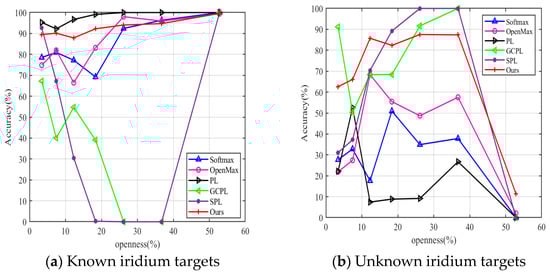 Figure 18a,b compare the recognition performance of the above open-set recognition works on known Iridium target samples and unknown Iridium target samples in the testing set, respectively. The open-set recognition methods based on Softmax probability all use the threshold recommended in [24]. It is clear that is not suitable for our data in some . Softmax, OpenMax and PL work well for known Iridium target recognition, but it is not satisfactory for unknown Iridium target recognition. GCPL and SPL may fail when recognizing known Iridium targets. We attempt to determine a good threshold, but the output of the Softmax layer is too confident. In addition, we find that different network initialization parameters also affect the output probability of the Softmax layer. This adds difficulty to the selection of threshold . When , our proposed joint decision algorithm is more efficient. When , all methods fail to recognize unknown Iridium targets because of the maximum . Even so, our method still has better generalization ability than other methods.