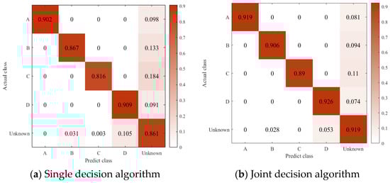 The second experiment proves that the joint decision algorithm is superior to the single decision algorithm. We still consider the situation when . Figure 20a,b show the confusion matrix when using the single decision algorithm and the joint decision algorithm, respectively. The difference between the two algorithms is that different distance rules are used. Figure 20a only considers the prototype distance, while Figure 20b uses the prototype distance and the center distance. We can find that no matter which distance rule is used, there is no confusion between the known Iridium target features. Because the unknown Iridium target features are likely to be close to a certain type of prototype, some unknown Iridium target samples may be misidentified as known Iridium targets. In addition, the use of distance rules can also cause the known Iridium target samples to be misidentified as unknown Iridium targets. When the prototype distance and center distance are jointly used, we can see that the recognition accuracy of both known and unknown Iridium targets will be improved. It reflects the effectiveness and reliability of the proposed joint decision algorithm in open set recognition of eight Iridium targets.