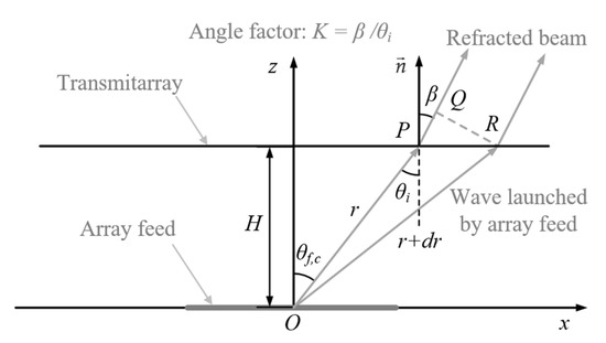 When a wave propagates through a medium, the wave path is always bent in the direction of the phase latency. Therefore, in order to manipulate the direction of the beam, an additional phase must be added to the wave launched by the array feed. The following derivation is a general case for calculating the phase of a fixed delay, i.e., the defocused phase . In general, let the transmitarray aperture be a surface formed by rotating an arbitrary curve around the z-axis, with the antenna elements arranged uniformly and continuously on the surface. The parametric equation versus the spherical angle of the arbitrary curve is expressed as . As shown in Figure 1, the wave front of the refracted beam is in equiphase.