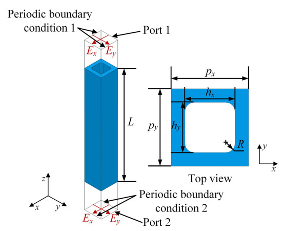 Inspired by the waveguide element proposed in [14], a square waveguide element is employed for phase manipulation. The metal material of the waveguide array possesses several benefits, such as high mechanical strength, high power capacity, high machining accuracy and a lack of dielectric losses compared with PCB elements. The structure of the square metal waveguide element is shown in Figure 3, where L is the thickness along the propagation axis, and are the hollow dimensions along the x and y axis, respectively, and are the periodicities of the array along the x and y axis, respectively, and R represents the radius of the fillets around the corners. The dimensions and remain equal, in order to support the propagation of dual-linear polarization. The dimensions and remain equal, thus forming square lattice arrangement of the array. Fillets are necessary in mechanical processing of perforation.
