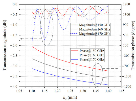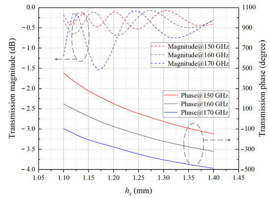 The aperture field needs to maintain a certain transmission amplitude while correcting the phase at each point of the aperture, which is the basic requirement of the element design. The results show that the element can cover at least 360° of phase shift range in the 150–170 GHz band. However, in the subsequent step of matching the ideal design phase with the actual element at multiple frequencies, if the 10 mm thickness is selected, the compensation phase provided by the element is limited to some extent, and the total phase error is not manageable enough to be reduced by optimization. Thus, according to (12), increasing the thickness of the element will expand the phase shift range, which can be extended to exceed one period of 360°. The wider the bandwidth for the compensating phase, the richer the unit templates available in the calculation database, and thus the easier it is to reduce the total phase error when performing multi-frequency phase matching in the following section. However, considering the difficulty of the actual mechanical processing, the element cannot be thickened infinitely, and secondly, as the thickness increases, the more sensitive the machining errors versus hollow dimensions is, thereby the larger phase perturbation compensated by the actual element is. After a compromise, the thickness is taken as L = 16 mm, and the magnitude and phase characteristics curves at 150 GHz, 160 GHz, and 170 GHz are presented in Figure 5.