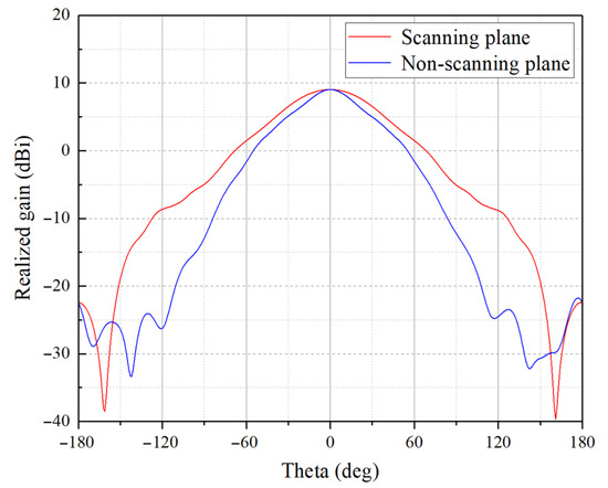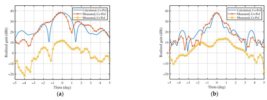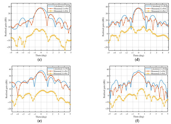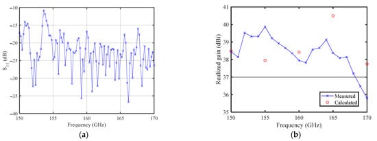Figure 16a shows that the measured is always below −11 dB at all operating frequencies. The measured and calculated results of the TAA are compared in Figure 16b and Figure 17. It can be seen from Figure 16b that the gain error reaches a maximum 2.2 dB at 165 GHz, which is explained in the following paragraph. Figure 17 shows the calculated Co-Pol radiation patterns and the measured ones at 150, 160, and 170 GHz, respectively, where the scanning plane corresponds to E-plane, and the non-scanning plane corresponds to H-plane. The measured Cr-Pol levels are also shown in Figure 17, which are always 25 dB below the main beam at all calculated operating frequencies.