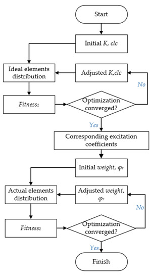The amplitude and phase distribution within the aperture can be obtained by modulating the phase of the electromagnetic wave through the elements and calculating the far-field electric field value using the superposition method. After obtaining the initial AELPs, the excitation coefficients of the feed can be determined by the following optimization algorithm.