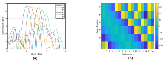 The subscript of port is expressed as , ranging from 1 to 16. For a particular spherical angle , when the excitation of the ith port is , the corresponding electric field value is . Among the 16 ports, the port with the largest value of the AELP is selected as the first port and determined as the highest priority port. Specify the highest priority port excitation value as , i.e., and . Next, superimpose the remaining 15 ports’ electric field values with that of the highest priority port in order to improve the port synthesis efficiency (PSE) as follows: