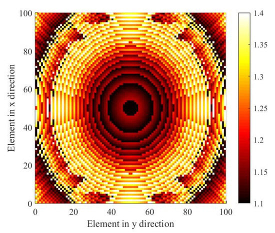 In order to obtain the initial AELPs for all array feed units in the early stage of this design, we assume that the transmitarray is ideal and completely lossless, i.e., the transmission magnitude is unity. The arrangement of actual transmitarray elements will be described in the subsequent process.