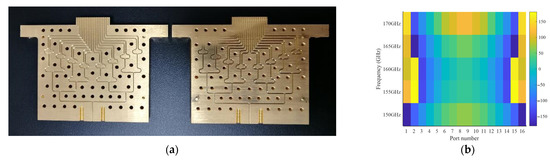 Waveguide feeding network designed at 160 GHz: (a) profile; and (b) excitation phases in degree.