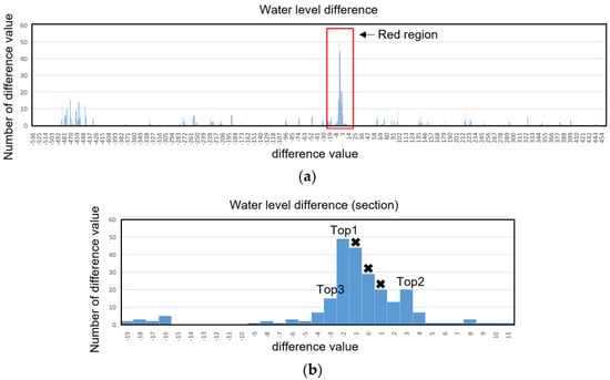 Figure 3. Difference in water level analysis process. The waterline of 24 April 2021 and 1 May 2021 is used for example analysis. (a) Statistical results of difference in pixel water level at different positions. (b) Enlarged graph of the difference in pixel water level at different positions of the top three peaks in the red region. A cross indicates that the data there has been removed due to numerical fluctuation.