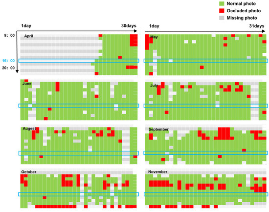 Figure 5 shows the statistical distribution of all image data collected during the test. The y-coordinate shows the time change over the course of a day, and the x-coordinate shows the time change over the course of a month. The vacant position indicates that the camera lacks power, resulting in failure to take images. The red position indicates that the target river is obscured by a hole or fog in the image. The green position indicates a normal photograph. The blue box is the viewing window at 16:00.