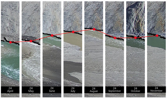 Figure 6. Monthly variation of water level from 24 April 2021 to 24 November 2021. The red dots are the transverse centers of the boundary lines and Red lines make visual changes easier to notice.