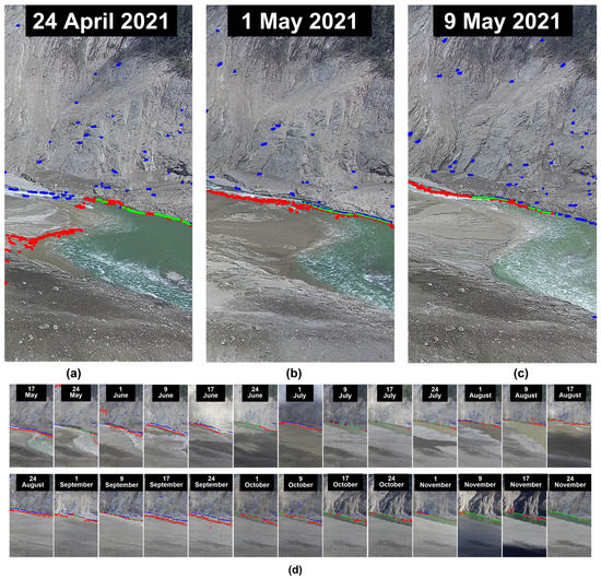 Figure 7. Visual comparison. Observations are made every seven days from 24 April 2021 to 24 November 2021, and the color red denotes the water level identified by RG. The color blue is the water level identified by the proposed algorithm. The color green indicates the overlap of water level identified by the two algorithms. (a) Visual comparison of 24 April 2021 (b) Visual comparison of 1 May 2021 (c) Visual comparison of 1 May 2021 (d) Visual comparison of 1 May 2021 to 24 November 2021.