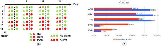 Figure 8. Alarm situation and indicator comparison. We counted the alarms from 1 May 2021 to 24 November 2021 and compared the corresponding indicators. (a) Alarm distribution. Green indicates that the system does not automatically alarm, and red indicates that the system automatically alarms. The three cells in a monitor, from left to right, are labeled as follows: RG, Ours, and truth. For simpler visual comparison, the true values are divided by a dotted line. (b) Indicator comparison. Comparison between RG and Ours in ACC, PRE, TPR, FPR, and FNR.