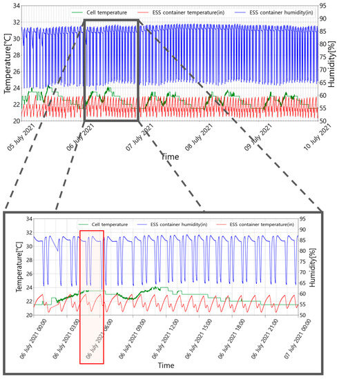 In general, an ESS has quality assurance standards for the operating environment, and each manufacturer provides an appropriate temperature and humidity management range [37]. The operating environment of an ESS must be managed within the operating range provided by the manufacturer. It is recommended that the ESS container used in this study be operated at 35~75% humidity and 18~28 °C. Figure 2 shows an example of the relative humidity, temperature of the container, and battery cell temperature during summer. In this example, the set temperature of the air conditioner inside the ESS container was set to 21 °C. As shown in Figure 2, the indoor temperature of the ESS container was maintained at 20.3~23.1 °C for five days (5 July 2021 00:00 to 9 July 2021 24:00); however, the maximum humidity was over 85%, exceeding the appropriate operating range.