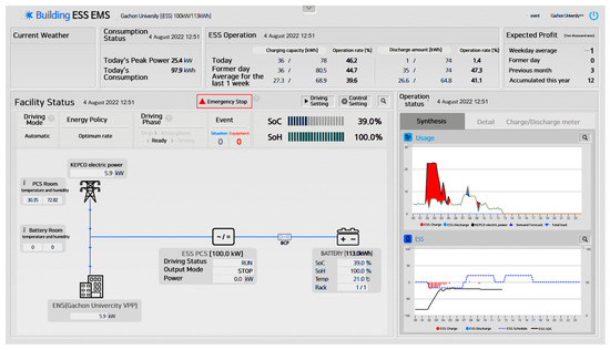 Figure 4 shows a screenshot of the ESS monitoring system. The monitoring parameters include the charge–discharge schedule, battery voltage and current, state of charge (SOC), state of health (SOH), battery cell temperature, AC 3-phase voltage and current of the PCS input side, and the DC voltage and current of the PCS output side.
