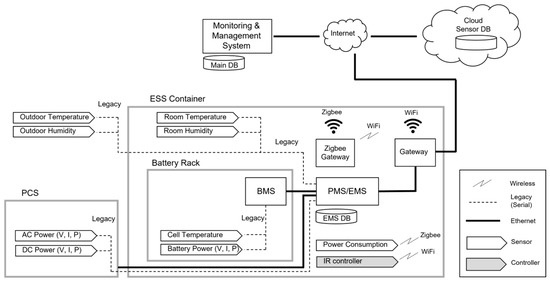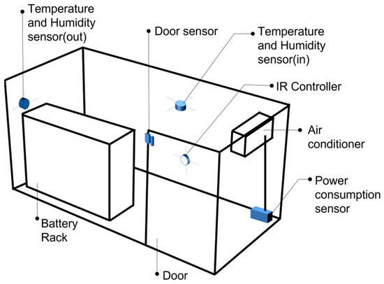 Figure 5 shows the locations of the sensors installed inside and outside the ESS container. The ESS includes PCS-side sensors that measure power data, such as voltage, current, and power. In addition, it includes BMS-side sensors that measure the internal data of the battery, such as battery cell temperature, battery internal voltage, current, and power. In this study, internal and external temperature sensors, humidity sensors, air conditioner power consumption sensors, and door open sensors were also installed. Furthermore, an infrared (IR) controller was installed to manage the air conditioner.