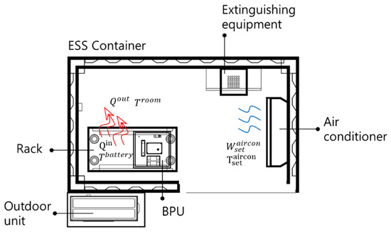 An energy storage system (ESS) is a system that has the flexibility to store power and use it when required. An ESS can be one of the solutions to mitigate the intermittency effect of variable renewable energy (VRE), such as photovoltaic and wind power [1,2,3]. An ESS is often implemented as a container-type package with an air conditioning system owing to the ease of installation and maintenance. However, the ESS generates heat through the oxidation reduction in ions in the battery during charging and discharging, increasing the battery temperature [4]. An increase in battery temperature reduces performance and shortens battery life [5]; therefore, battery health monitoring and management are important. Determining the state of a battery is essential for estimating its safety and lifespan. In [6], a methodology for battery life prediction and management based on artificial intelligence (AI) is discussed. Ali et al. [7] analyzed various methods for estimating battery health by classifying them into two types: experimental and model-based estimation. In addition, various methods, such as advanced sensing, big data, and multi-agent decision-making techniques are predicted to be used in the future. In [8], various aging and thermal models based on electrochemical models were investigated, and the required parameterization methods were summarized. In [9], the effects of the aging behavior of lithium-ion batteries was measured using an electrochemical-based model. The indoor temperature of the ESS container can be controlled to maintain the battery temperature below the target temperature. Generally, economical and simple forced air convection systems (FACS) are used to manage the indoor temperature of ESS containers [10]. FACS is a method of forcibly moving air for heat transfer of the fluid and installing an air conditioner in the ESS container to manage the battery temperature by controlling the room temperature [11].