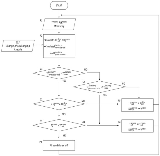 As shown in Figure 8, the rule-based air conditioner control algorithm used thermal and humidity models to determine the operation by determining the compliance with constraints based on real-time collection data and operational information. In this algorithm, the absolute humidity was calculated using the ESS charge–discharge schedule, indoor temperature, and humidity data. The absolute humidity to be achieved is computed using the target temperature and humidity. The humidity of the ESS container should remain within the target absolute humidity range while maintaining the battery temperature within a safe operating range.