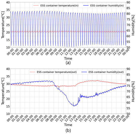 ESS operation results with the proposed control algorithm. Case 2: (a) the ESS container’s indoor temperature and humidity; (b) the ESS container’s outdoor temperature and humidity.