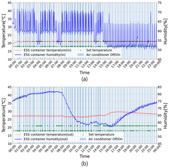 ESS operation results without the proposed control algorithm. Case 1: (a) the ESS container’s indoor temperature and humidity; (b) the ESS container’s outdoor temperature and humidity.