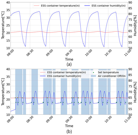 The ESS container’s indoor temperature and humidity for each case during the discharge period: (a) the ESS container’s indoor temperature and humidity during the discharge period (Case 1); (b) the ESS container’s indoor temperature and humidity during the discharge period (Case 2).