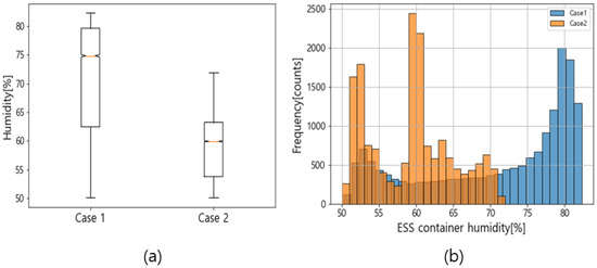Figure 12a shows the humidity distributions using a box plot for Cases 1 and 2. The upper whisker of the box plot represents the maximum score of the data, and the lower whisker represents the minimum. The upper quartile is the top 75% of values, and the lower quartile comprises the bottom 25%. A comparison between the box lengths of Cases 1 and 2 shows that Case 1 is longer, meaning that the data were more spread out. Figure 12a illustrates that the average daily humidity values in Cases 1 and 2 were 70.8% and 59.4%, respectively, showing a 11.4% reduction in the average humidity using the proposed method. The standard deviations in Cases 1 and 2 were 10 and 5.6, respectively, confirming that the humidity variability also reduced. Figure 12b shows the humidity in Cases 1 and 2 as histograms. A wide distribution, in the 50–80% interval, can be seen in Case 1 in Figure 12b. The frequency range exceeding 1500 was concentrated in the upper 79–81% range. Additionally, distribution in the 50–70% interval can be seen in Case 2 in Figure 12b, and the frequency ranges exceeding 1500 were 51–53% and 59–61%. The proposed algorithm moved the overall distribution range of the humidity to a lower range and lowered the degree of dispersion.