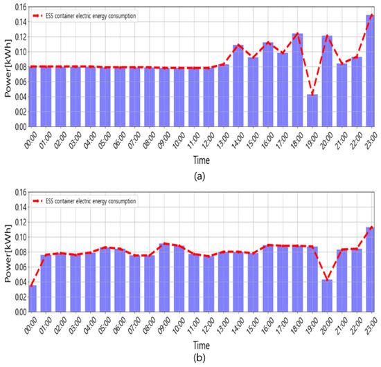 Power usage used to maintain the indoor environment of the ESS container: (a) ESS container power usage without the proposed control algorithm (Case 1); (b) ESS container power usage with the proposed control algorithm (Case 2).