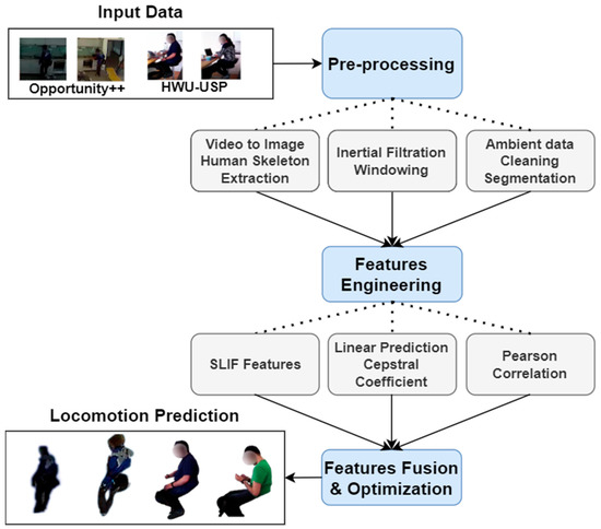 Two benchmarked IoT-based datasets have been selected to verify the proposed multimodal locomotion classification system. Three types of sensor data have been utilized from these two datasets, including wearable motion, ambient, and visual sensors. At the start, we propose that the multimodal IoT-based data be filtered through different techniques that will cater to the unique requirements of noise removal in each sensor’s nature. Next, the motion and ambient filtered signals are windowed, and video frame sequences are used to extract the skeleton model. Then, the features are extracted for each sensor type separately, followed by fusing them over time series. Further, the fused features have been optimized, and locomotion via ADL is recognized. Lastly, the HWU-USP (Heriot-Watt University/University of Sao Paulo) and Opportunity++ datasets are utilized for evaluation of the proposed multimodal IoT-based locomotion classification system. Following are the key contributions of our proposed locomotion prediction system: