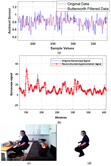 First, the ambient data has been pre-processed through the Butterworth [19] filter and displayed in Figure 2a. Then, we applied a wavelet quaternion-based filter [20] over the wearable motion sensor data and demonstrated the results in Figure 2b. Both ambient and motion sensor-filtered data are windowed for 4 s [21] each to further process the signals proficiently. Conversely, the visual data has been pre-processed by subtracting the common background [22] among all subjects, as shown in Figure 2c,d. It is further utilized to extract the skeleton model [23] from the human silhouette by extracting eleven skeleton points, including the head, neck, torso, elbows, wrists, knees, and ankles. Figure 3 describes the human skeleton modelling in detail over the HWU-USP dataset.