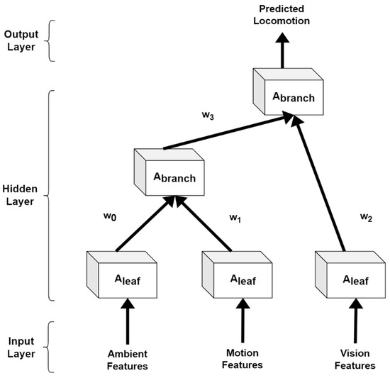 A recursive neural network (RvNN) [32] is a deep learning-based neural network where we apply the same set of weights recursively over ambient, motion, and vision data features. We have applied this network because RvNN can be used to learn distributed, structured data. Therefore, it is ideal for our proposed multimodal IoT-based locomotion prediction system. The parent n-dimensional vector can be calculated as: