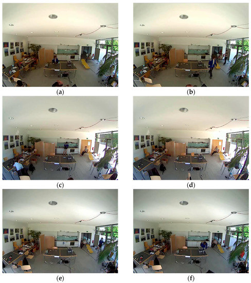 This novel dataset is an addition to the previously proposed Opportunity [14] dataset. A total of 12 participants performed two types of activity drills. Two kinds of activities have been recognized through this dataset, such as locomotion-level and low-level activities. This system focused on 17 activities performed in different drills, including close door, open fridge, open door, close fridge, open dishwasher, open drawer, drink from cup, close drawer, close dishwasher, clean table, and toggle switch. The dataset was recorded using seven body worn IMU sensors, 12 object sensors, 13 ambient sensors, and videos. The body-worn sensors, including InertiaCube3 and Xsens MT9, were placed over the subject’s shoulders, wrists, elbows, waist, knees, and ankles. Whereas the ambient sensors, including 13 switches and 8 3D acceleration sensors, were attached to objects like milk, spoons, water bottles, glasses, drawers, and doors. Videos were recorded at 640 × 480 pixels and 10fps [34]. Figure 11 presents a few sample images captured during video recordings where a subject is (a) cleaning the table; (b) opening the door; (c) opening the drawer; (d) closing the door; (e) opening the door; and (f) closing the dishwasher.