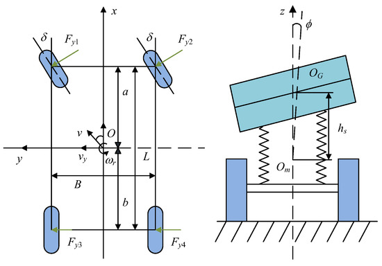 Given that the path tracking accuracy and the body stability of IV are difficult to achieve under extreme working conditions, we need to consider the body posture of the vehicle. In this study, a three-degrees-of-freedom vehicle dynamic model [13] considering the body roll is established, as shown in Figure 2. This model ignores the longitudinal motion of the vehicle, the role of the suspension, and the change in unsprung mass.