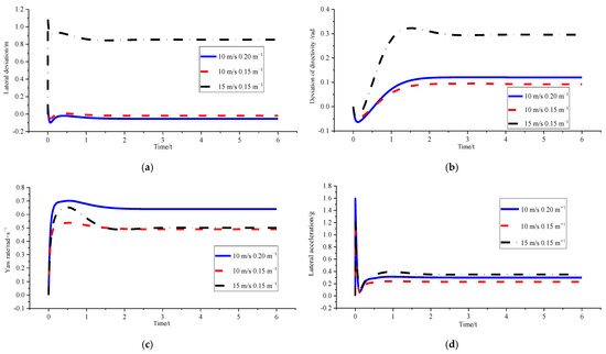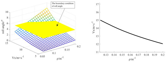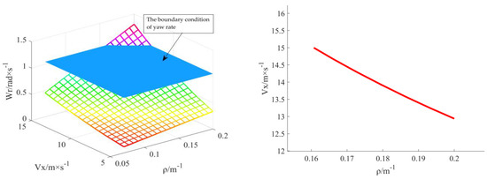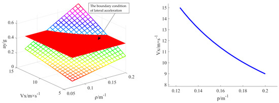 Figure 5 shows that the boundary values of the intersection line between the lateral acceleration response surface and the stability boundary surface are 0.124 m−1 and 9.262 m/s. This finding indicates that if the speed is lower than 9.262 m/s or the curvature is less than 0.124 m−1, the lateral acceleration of the vehicle cannot be greater than the set of 0.4 g, no matter how the curvature is adjusted. The optimal boundary value under the lateral acceleration limit should be 0.124 m−1 to ensure the stable driving of the vehicle.