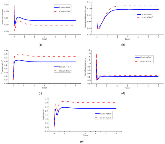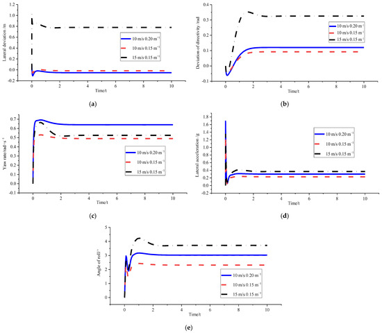 Figure 11. Comparison of optimised effects with different curvature. (a) Comparison chart of lateral deviations. (b) Comparison chart of direction deviation. (c) Comparison chart of yaw rate. (d) Comparison chart of lateral acceleration. (e) Comparison chart of roll angles.