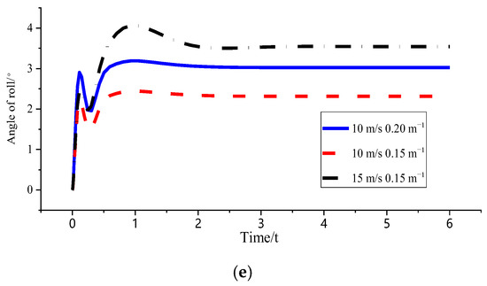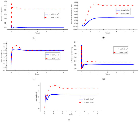 Figure 12. Comparison of optimised effects of different vehicle speeds. (a) Comparison chart of lateral deviations. (b) Comparison chart of direction deviation. (c) Comparison chart of yaw rate. (d) Comparison chart of lateral acceleration. (e) Comparison chart of roll angles.