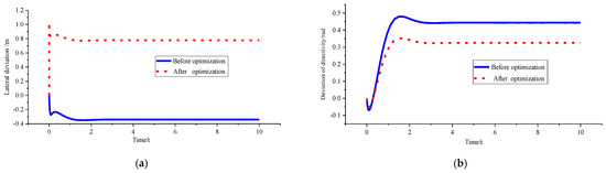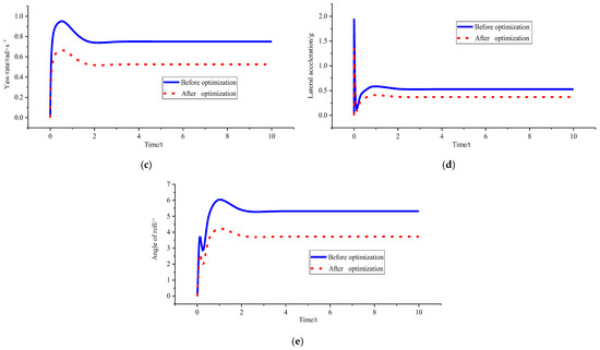 Figure 13. Comparison of optimised effects after hybrid working conditions. (a) Comparison chart of lateral deviations. (b) Comparison chart of direction deviation. (c) Comparison chart of yaw rate. (d) Comparison chart of lateral acceleration. (e) Comparison chart of roll angles.