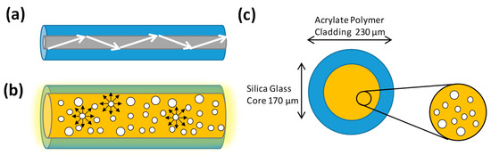 Traditional optical fiber is used to deliver an optical carrier containing data information from one end to the other. For single-mode fiber (SMF), the core and cladding diameters are 9 μm and 125 μm, respectively. For multi-mode fiber (MMF), the core and cladding diameters are 50 or 62.5 μm, and 125 μm, respectively. As shown in Figure 1a, as the refractive index of the fiber core is higher than that of the fiber cladding, light is refracted and restrained in the fiber core due to total internal reflection (TIR). The traditional optical fiber is not typically considered suitable for use as an extended light source. By introducing nanostructure scattering centers in the fiber core, very efficient light scattering through the circumference sides of the optical fiber can be achieved, as shown in Figure 1b. Figure 1c shows the proposed LDOF [46,47] which has a silica glass core and acrylate polymer cladding with diameters of 170 μm and 230 μm, respectively. By using lower-index acrylate polymer cladding, the numerical aperture (NA) of the LDOF is about 0.46. The uniformity of the extracted light around the circumference can be adjusted by controlling the number of scattering sights in the fiber core. These nanostructured scattering centers range in size from 50 to 500 nm; hence, they can effectively scatter the transmitting light in the visible wavelengths.
