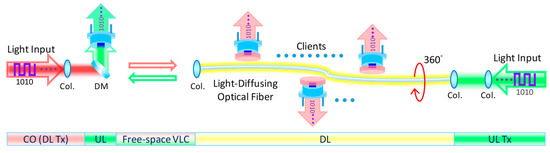 In this work, we put forward and demonstrated a bi-direction free-space VLC system supporting multiple moveable Rxs using a LDOF. The proposed LDOF had a silica glass core and acrylate polymer cladding with diameters of 170 μm and 230 μm, respectively. The NA of the LDOF was about 0.46. The uniformity of the extracted light around the circumference was adjusted by controlling the number of scattering sights in the fiber core. These nanostructured scattering centers ranged in size from 50 to 500 nm. The LDOF can provide a field of view of 360° around the fiber circumference and 120° along the LDOF. In the proposed bi-directional system, the DL signal was launched from a CO away to the LDOF on the client side via a free-space transmission. When the DL signal was at a wavelength of 633 nm and was launched to the LDOF, which acted as an optical antenna to re-transmit the DL signal to different moveable Rxs. The optical signal emitted via the LDOF was safe for human eyes. The UL signal had a wavelength of 520 nm and was sent via the LDOF towards the CO. In a proof-of-concept demonstration, the LDOF was 100 cm long, and the free-space VLC transmission between the CO and the LDOF was 100 cm. In principle, the system can support a large number of Rxs simultaneously as long as there is enough space along the LDOF circumference. Regarding the green UL signal, from a data rate of 100 Mbit/s to 600 Mbit/s, it was error-free. BER started to increase at data rate of 700 Mbit/s, and the BER was 1.14 × 10−6. BER of 2.15 × 10−3 was measured when the UL data rate is 850 Mbit/s, satisfying the 7% pre-FEC (pre-FEC BER = 3.8 × 10−3) threshold. Regarding the red DL signal, if a low data rate of < 190 Mbit/s was employed, error-free detection can be achieved for the whole 100 cm-long LDOF. If higher data rates of 200 Mbit/s and 210 Mbit/s were employed, FEC performance (BER = 3.8 × 10−3) could be guaranteed. However, when the data rate was increased to 220 Mbit/s, only half the length of the LDOF could satisfy the FEC transmission.