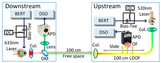 Figure 5 illustrates the optical spectra of the DL and UL signals emitted by the 633 nm and the 520 nm LDs measured by a spectrometer (Ocean® Insight USB2000). The experimental setup used to obtain the optical spectrum in Figure 5 is the same as that used in Figure 3, in which the APD is replaced by a spectrometer. The optical detector of the spectrometer is located close to the LDOF. It can be observed that both the DL and UL signals have narrow linewidths and high side-mode suppression ratios.
