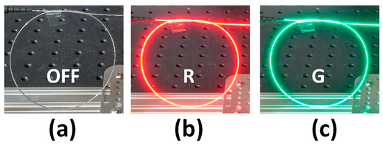 Photographs of the LDOF (a) without, (b) with the red light, and (c) with the green light launchings.